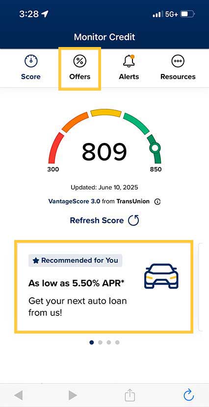 - When you're logged into Credit Monitoring, you can access loan offers by either: