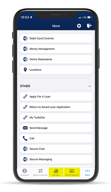 BillPay and Check Deposit will be moving to the "More" tab. | Send Money and Debit Card Controls will replace these buttons on the main menu. |